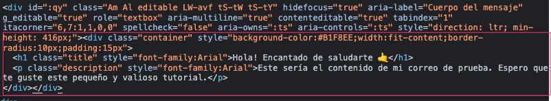 <p class="description" style="font-family:Arial">Este sería el contenido de mi correo de prueba. Espero que te guste este pequeño y valioso tutorial.</p>